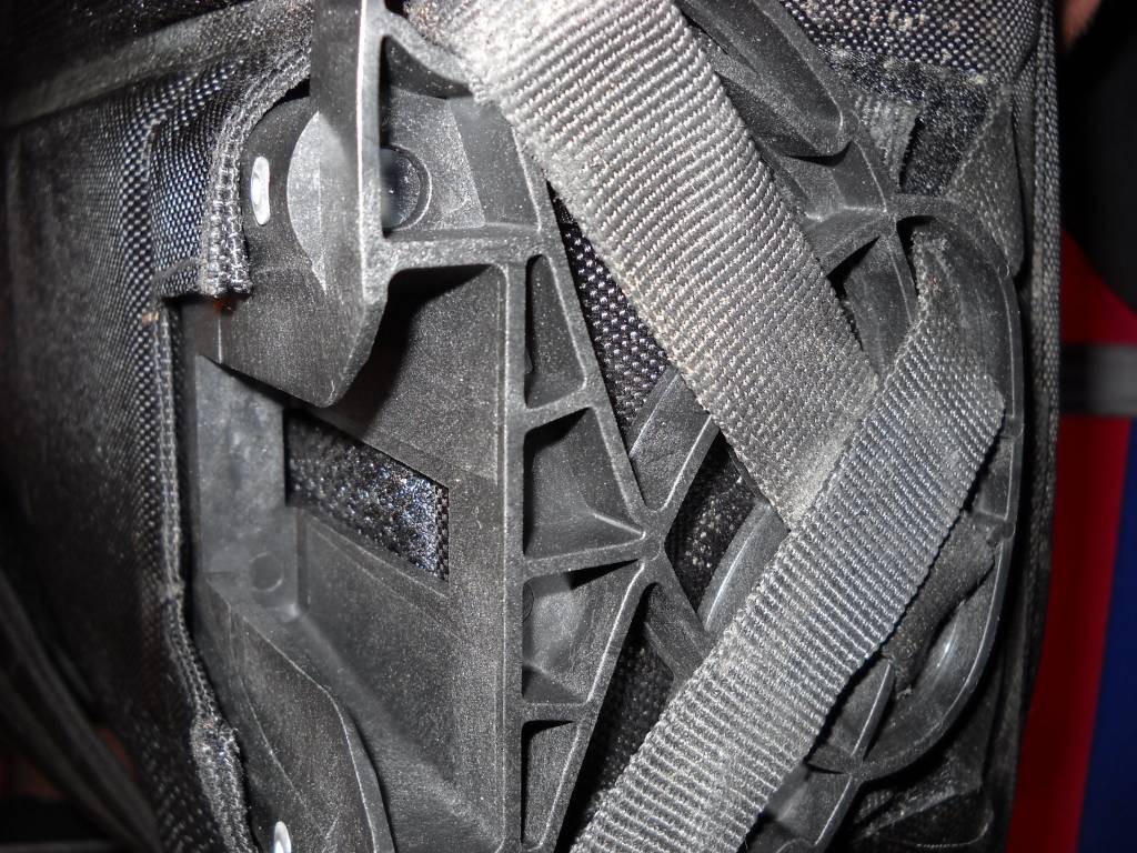 La société Theravada vend aussi son autre invention, un sac à dos pour vélo pliant. Le support sur la base de la fourche est le même que celui des Brompton. Le sac peut être utilisé sur les Brompton, les Dahon et les Tern. Le Myriapod pour tirer la valise et le sac sur l'avant ! Ou bien, quand vient le moment de porter le vélo, le sac passe dans le dos. 3° photo : le sac vu du dessous, avec le système de clips.