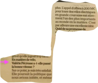 P. Serne félicite le CR d’Ile-de-France pour sa politique cyclable, essentiellement de la location en libre-service de vélos à assistance électrique. Pour le président du Club des Villes Cyclables ça va être difficile d’expliquer qu’il faut avant tout des pistes et du stationnement … Mais s’il félicite on comprend pourquoi, c’est surtout parce qu’ils continuent ce qu’il avait commencé ! Le Parisien, 5 janvier.