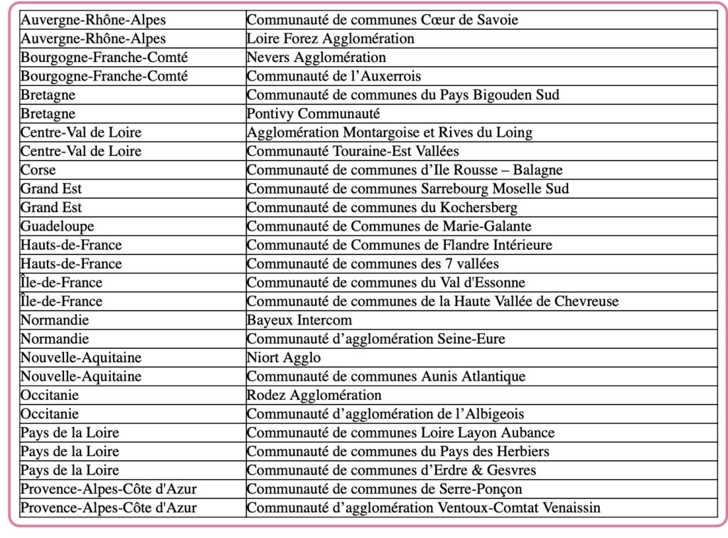 128 communautés de communes ou d’agglomération se sont portées candidates, 27 ont été choisies. Ces futurs « territoires cyclables » sont aussi diverses que possible, sur le littoral, en montagne, urbains ou péri-urbains, ruraux, ultramarins, frontaliers… Les régions ont 2 ou 3 lauréats, sauf la Corse et la Guadeloupe qui n’en ont qu’un chacune.
