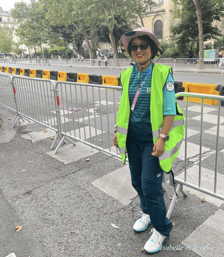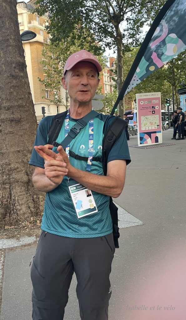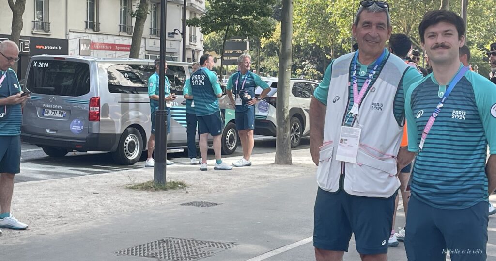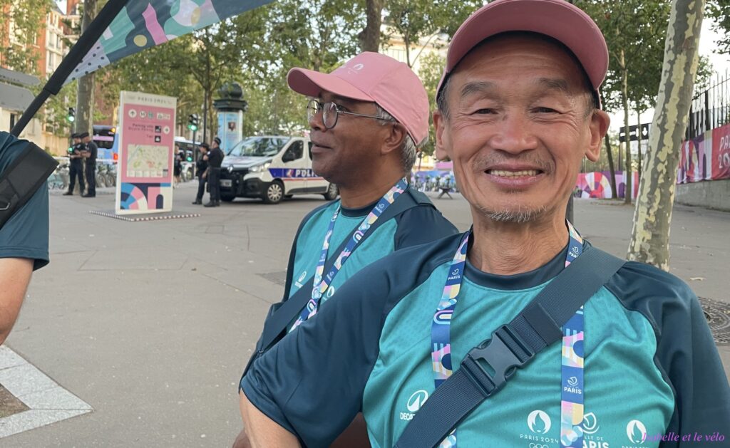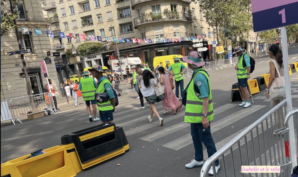 Les bénévoles du COJO sont plutôt au contact des sportifs, ceux de la Ville de Paris organisent les flux de piétons et jouent un rôle d’accueil, d’orientation et de renseignements. Les cloisons entre eux ne sont pas totalement étanches, de même qu’avec les forces de l’ordre qui se retrouvent elles aussi à renseigner ou faire traverser. On n’a jamais vu des agents de la force publique, soldats, gendarmes, policiers … aussi détendus et prêts à la causette. Tout se passe dans une ambiance calme et joyeuse, même si, en particulier le matin, les effectifs peuvent être un peu faibles, et le soir presque trop chargés. Ce sont des détails.