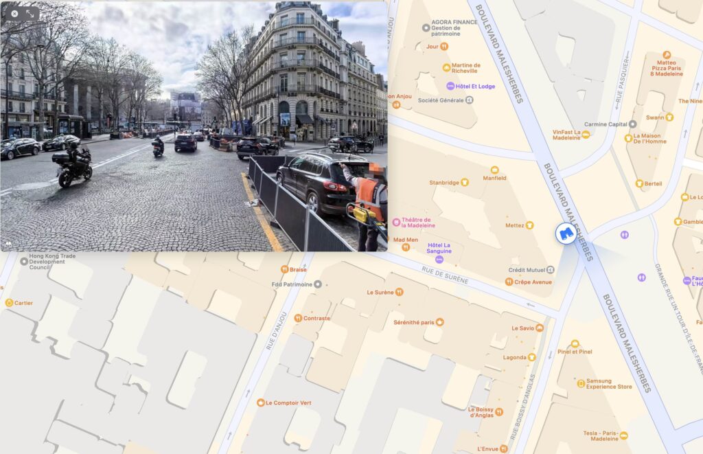 Après visite sur les lieux je formule une autre explication. C’est la forme de ce fameux tourne à droite vers la rue Boissy d’Anglas qui pose problème. C’est très évasé. Il faudrait que cela se rapproche de l’angle droit, afin d’obliger les automobilistes à lever le pied, et leur permettre d’avoir une vue vers leur droite et leur gauche, c’est-à-dire vers la piste cyclable et le trottoir. Cela raccourcirait aussi la traversée. J’ajoute sans le décrire car c’est complexe que le carrefour lui-même est source évidente d’accidents. (26 octobre 2024)