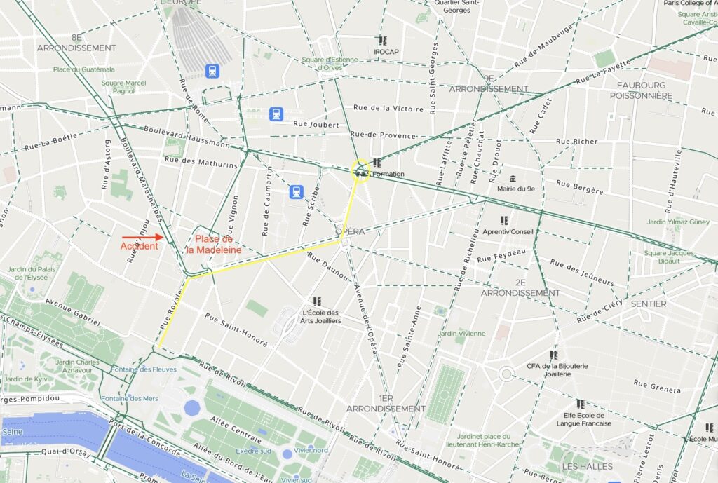 En clair : l’accident s’est produit à l’angle de la rue Boissy-D’Anglas. L’automobiliste et le cycliste roulaient dans le même sens, en direction du sud.