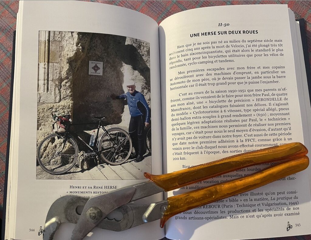 Le pavé se termine par une intéressante bibliographie, ou plutôt une liste des meilleures sources, avec une sorte de biographie d’Henri et de son frère Paul (que j’ai bien connu et dont je regrette le sale tempérament qui me le rendait sympathique). L’ouvrage se termine sur les portraits de grands cyclos disparus et sur un album complémentaire de photographies ainsi que de longues citations d’auteurs amis. Vous saurez enfin qui est Edius, quant à moi je figure page 102 avec mon ancien vélo bien-aimé.