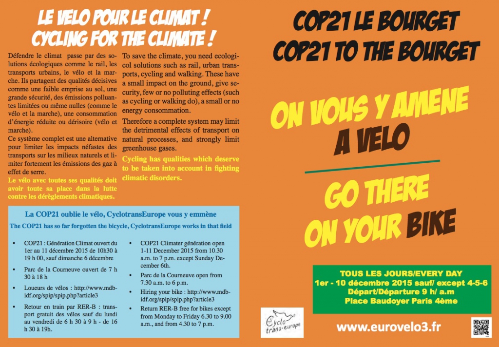 Transports en commun gratuits mais saturés, routes interdites, reste le vélo. Faites-vous accompagner ! La COP21 oublie le vélo, CyclotransEurope vous y emmène.