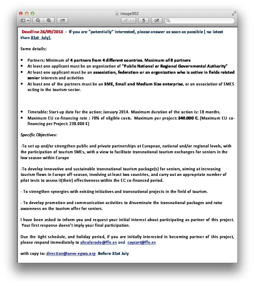 Open Call for grants from the European Commission – Enterprise & Industry Directorate General; a proposal about “Senior Tourism on Greenways” will be promoted from the European Greenways Association and Spanish Railways Foundation (Spanish greenways programme coordinator)