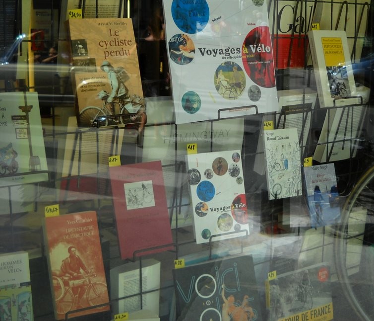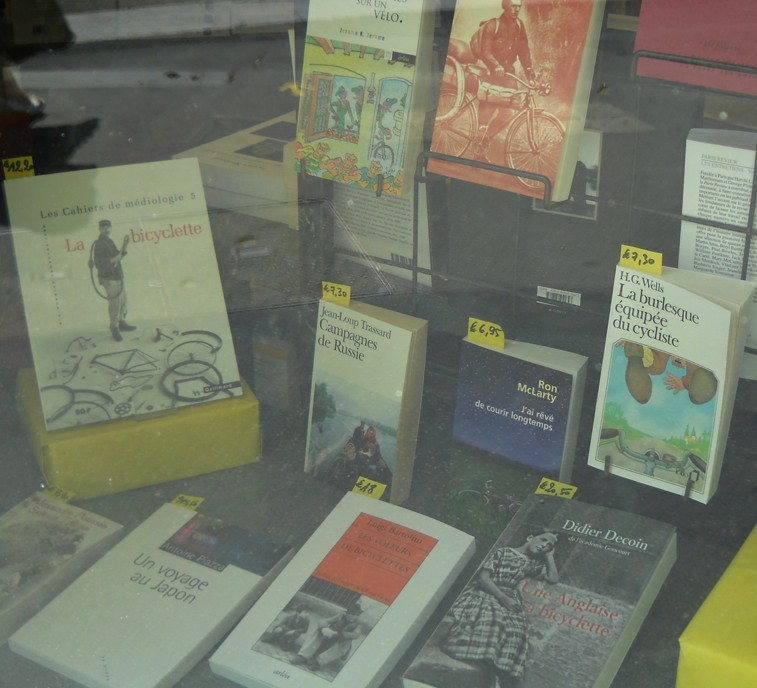 -- Parisiens et visiteurs ! Entre Vieux Campeur et Sorbonne ... la librairie Compagnie (58 rue des Ecoles) a fait sa vitrine sur le vélo ! Romans, récits, etc. du récent, du ancien : extra ! Pas mal de ces bouquins ont été présentés ici, et ... celui dont j'ai dit le plus grand mal n'y est pas !