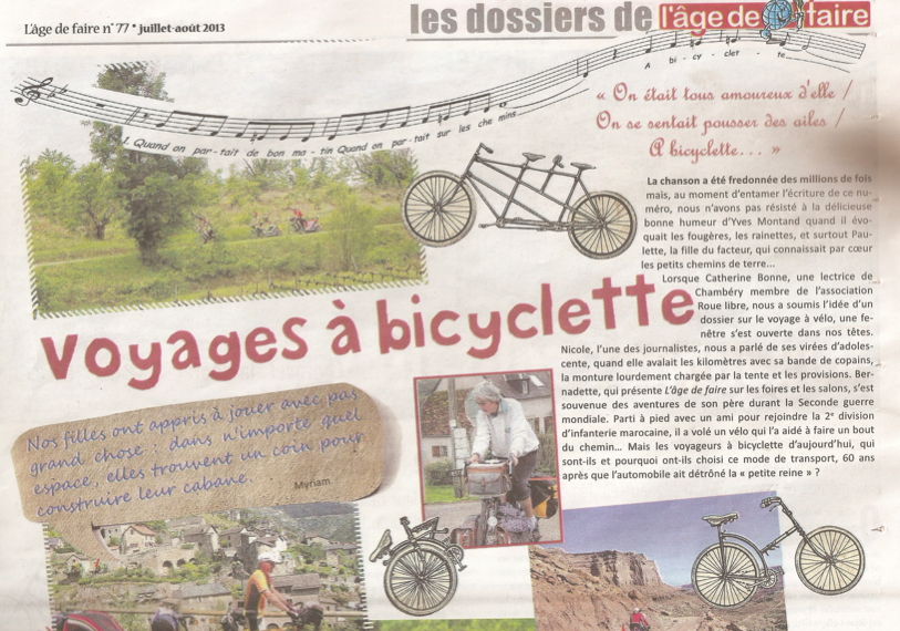 4 pages, plus une et plus une encore... Le journal L'âge de faire - des outils pour réinventer le monde - publié sur papier recyclé, plié, édité par une coopérative, rédigé dans les Alpes de Haute-Provence, imprimé dans le Loiret ... bref ce canard alternatif nous offre pour cet été un éloquent dossier sur le voyage à vélo. Emotion et conseils concrets sont au rendez-vous, le tout pour 1 €.