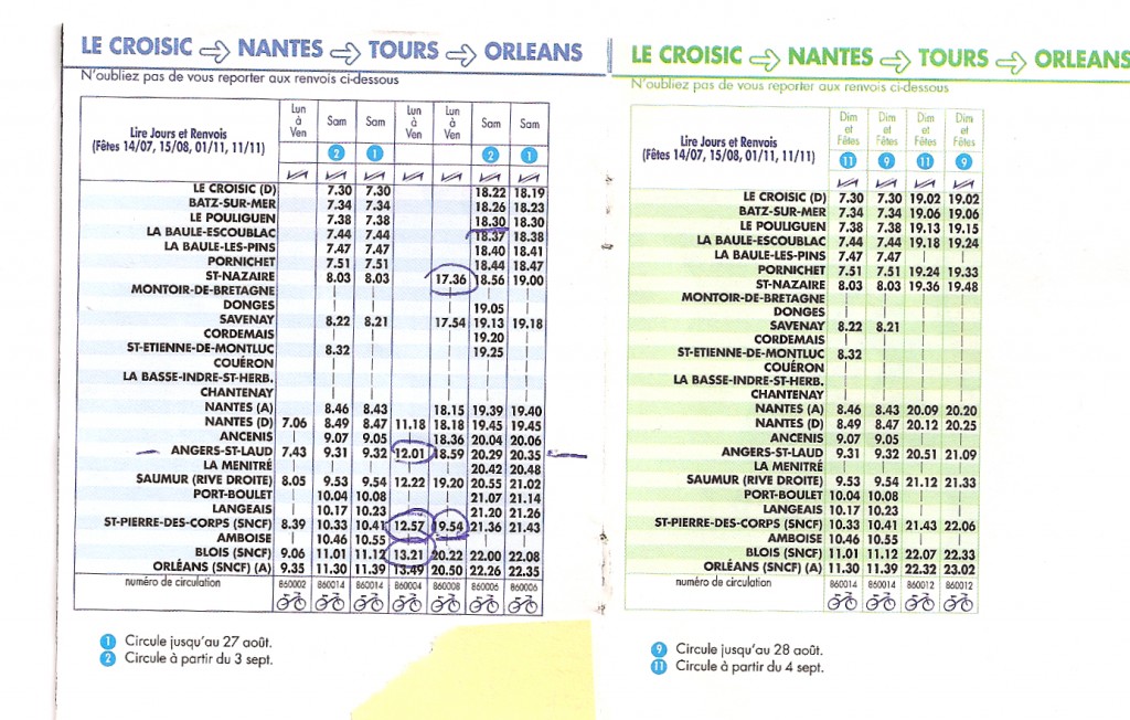 J’avais pris la fiche horaire « Orléans – Tours – Nantes – Le Croisic » et retour, avec La Baule, Pornichet et Saint-Nazaire, notamment. La veille au soir, je découvre que … il n’y a de trains que tôt ou tard, et, de toutes façons, que les samedis et dimanche. Il me faudrait revenir à Saint-Nazaire (et ses volées d’escaliers) pour le seul train en semaine, à 17 h 36 …