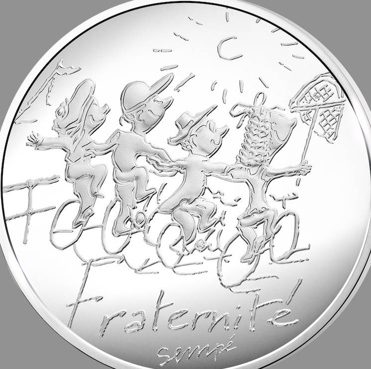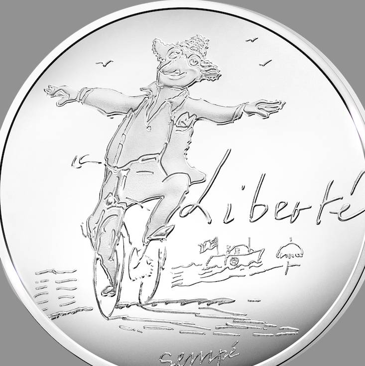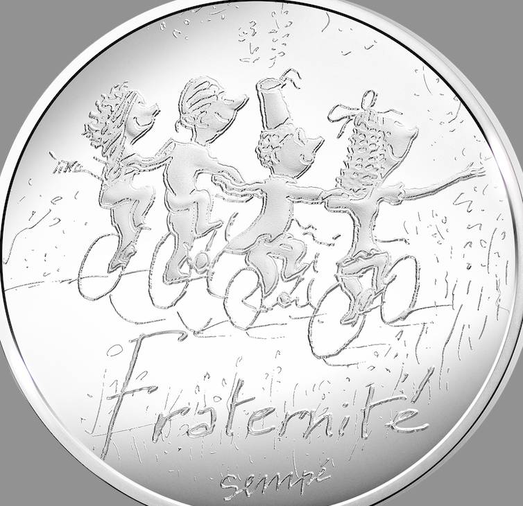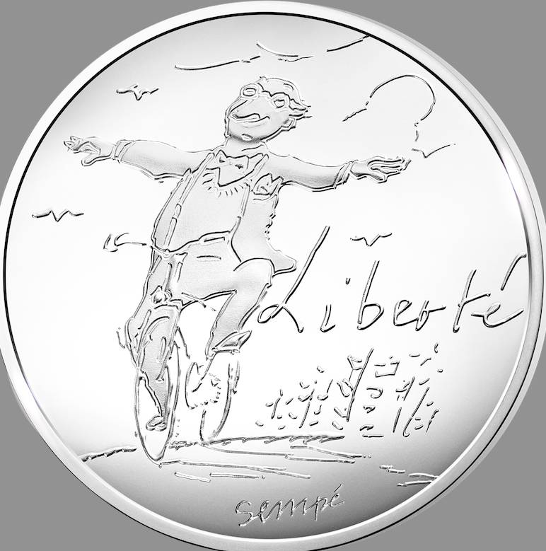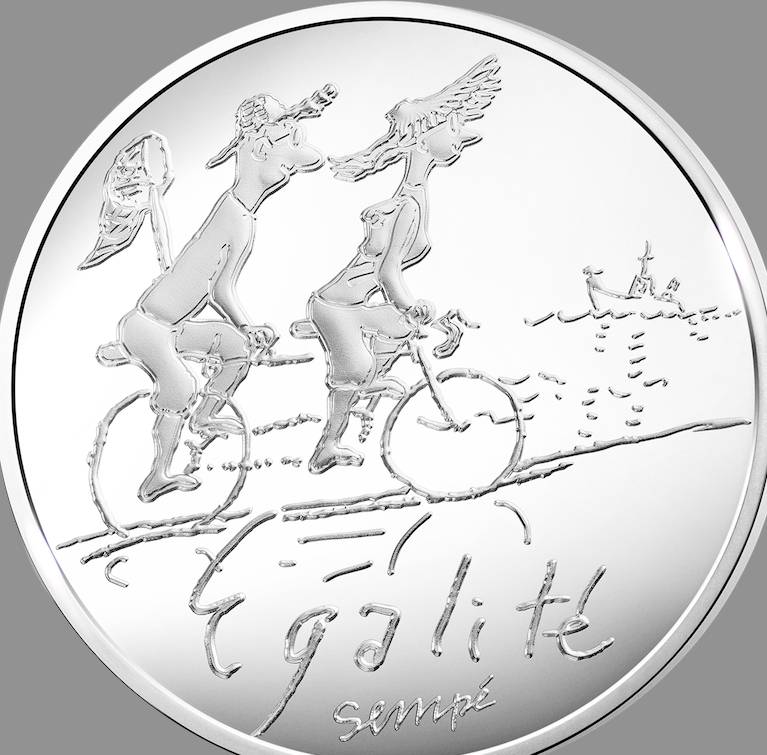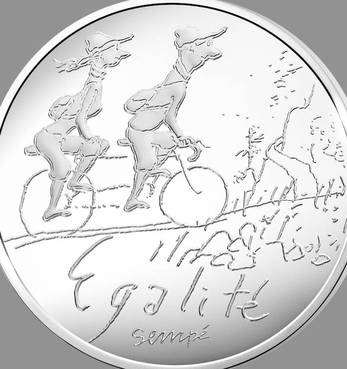 La Monnaie de Paris édite des pièces de collection dessinées par Sempé. Elles représentent de joyeux cyclistes plutôt délurés : un fada qui semble s'échapper d'une cité de banlieue pour illustrer la Liberté, un couple en tandem pour l'Egalité, et quatre gosses se tenant par les épaules pour la Fraternité.