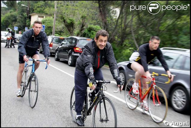 Cet été un de nos ex-présidents qui aimerait bien le redevenir a bénéficié d'un dossier entier du supplément - magazine du journal Le Parisien. Habilllé en coureur noir, bardé de marques, mais avec des cale-pieds à courroie (même en changeant de vélo), mais des soquettes blanches (l'honneur était sauf). Ses performances ont paru peu crédibles à nombre de commentateurs. Le visage crispé du sujet et la position tendue que je lui remarque, sur ces photos comme sur d'autres, ne donne en tout cas pas l'image d'un homme heureux avec son vélo. "La photo non retouchée montre un étonnant contraste entre le visage crispé de Sarkozy et la décontraction apparente du garde du corps, qui semble presque rouler sur du plat !" note de même Le Nouvel Obs. Comme sur la photo ci-dessous, un peu plus ancienne, où gardes du corps et cale-pieds sont intacts.