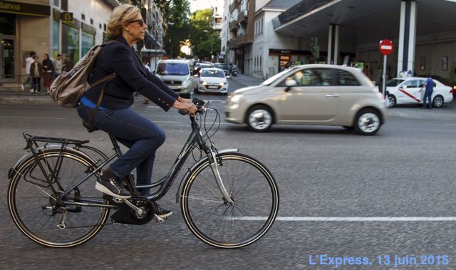 A Madrid c'est Manuela Carmena qui a été élue, candidate de Podemos. Elle est cycliste, très à gauche, et pourtant elle a trouvé que ses amis des Indignados étaient très traditionnels : « J'ai découvert dans l'activisme une attitude très classique, très rigide, digne des partis traditionnels”. » Le Figaro, 17 juin. Patatras ! Il paraît que maintenant elle va à l'Hôtel de ville en métro.