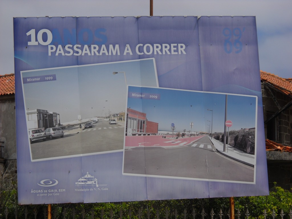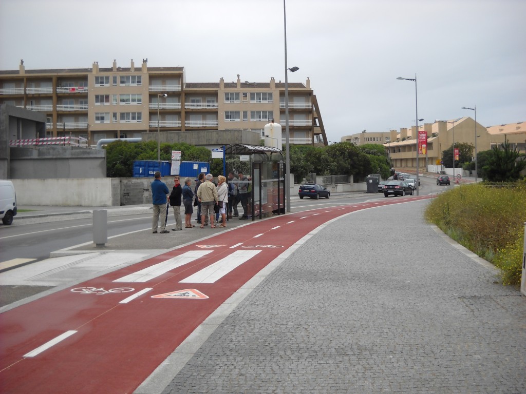 La sortie de Porto par le sud. Nous avons pris le métro, puis trouvé à peu près facilement notre chemin. Pistes cyclables en construction le long des plages avec reprise des largeurs de voirie. Pistes quelquefois extra-larges, toujours à double sens. Pas de notion d’itinéraire cyclable, et ruptures de continuités. Gros investissements au sud aussi, avec grignotage et étouffement d’anciens hameaux populaires. Pas mal de résidences de tourisme, y compris appartements, et les mêmes cafés ou restaurants qui semblent construits par la puissance publique.