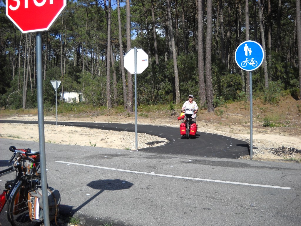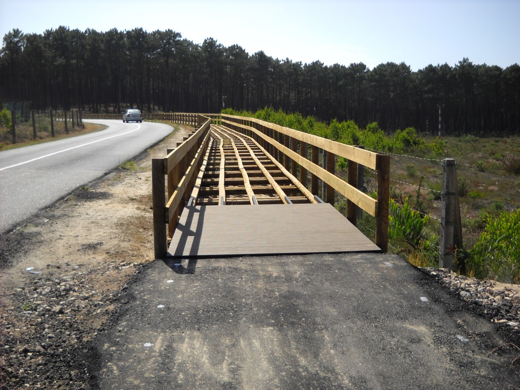 La piste cyclable, ou « Ecopista », entre Esmoriz et Ovar. Elle longe la route entre deux plages, à travers la forêt, sur environ 15 km. Elle aura nécessité 7 ou 10 passerelles en bois et coûtera 648 257,83 (sic) €. Sa traversée par la route donne la priorité à cette dernière. Dénivelés estompés, sinueuse tout en restant proche de la route, souvent prioritaire sur les adjacentes : pas mal, mais étroite et avec un changement de côté. Cela coûte plus cher que d'avoir coupé la route.