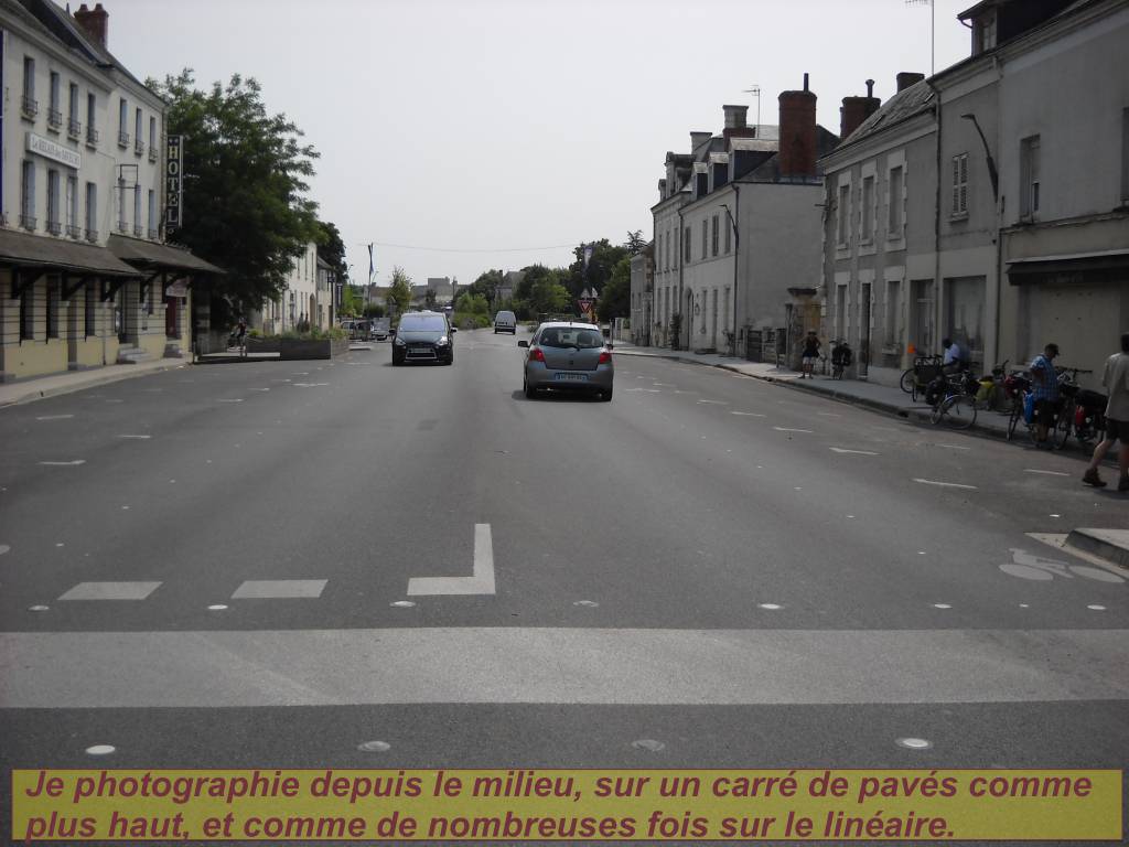 Le secret, là aussi vu rapidement : une succession de décrochements à angle droit, aucun passage piéton officiel, aucun marquage axial, aucun feu, pas de panneaux ! La priorité est à droite partout ... Les couloirs ne sont pas peints, il y a seulement une bande de clous au sol, très discrets, de chaque côté, qui préserve un espace pour les cyclistes. Les décrochements carrés, dont on nous dit qu'ils le sont pour des raisons patrimoniales, sont sûrement une idée forte : ils n'ont pas d'aspect routier et ressemblent à des petites places, et ils ont des coins. Ils sont impossibles à passer vite.