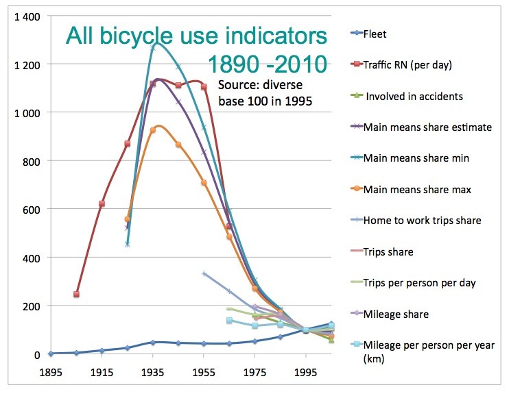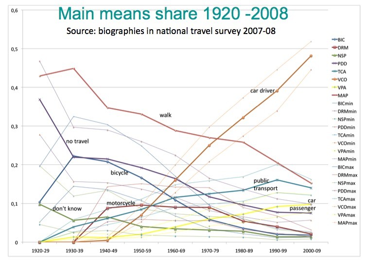 Dans la dernière enquête nationale sur les transports de 2007-08, un volet biographique a recueilli environ 1100 grilles dans lesquelles les personnes interrogées ont donné leur moyen de transport principal pour chaque année de leur vie. Cela a permis d’estimer la part de la bicyclette comme moyen de transport principal depuis les années 1930.