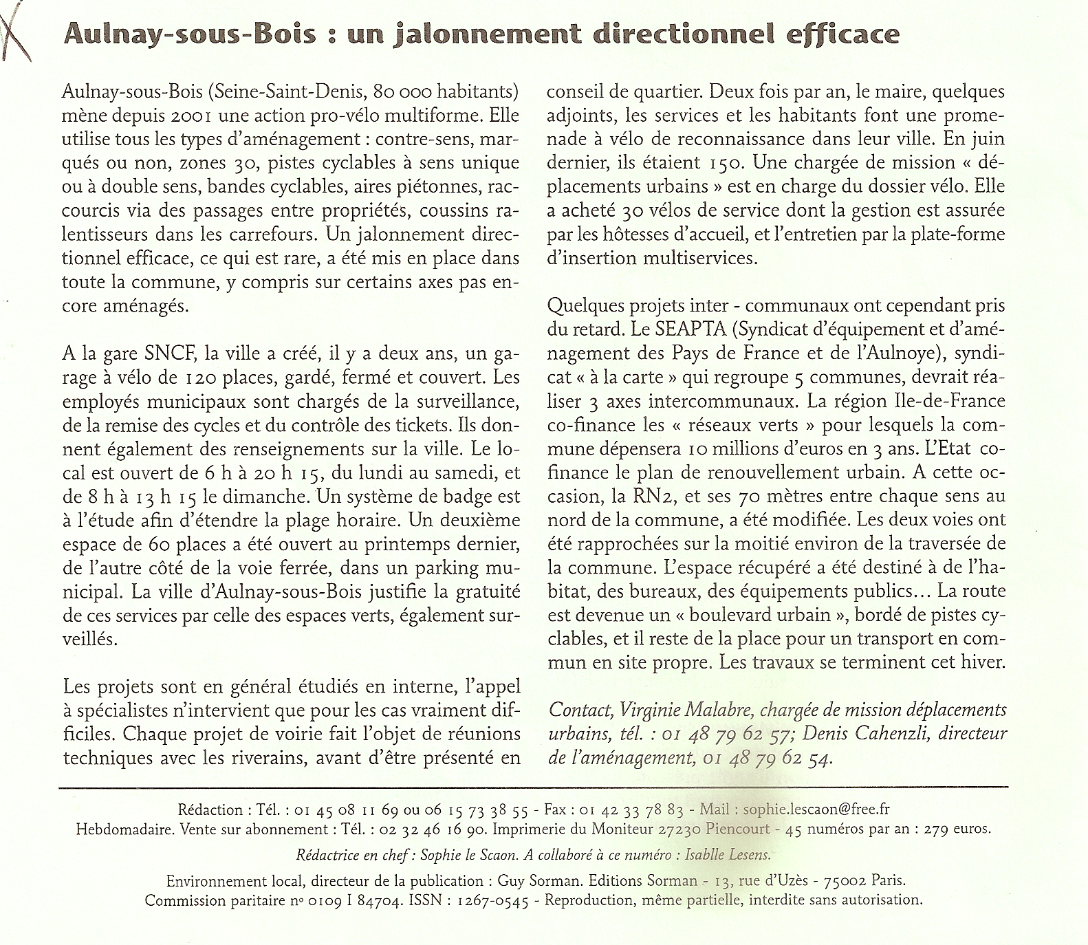 En matière de déplacements, nous avons déjà récompensé la ville de Lagny-sur-Marne pour le transport de déchets par remorque hippomobile, la commune de Rungis, pour la mise en zone 30 de l'ensemble de son territoire, la commune de Collégien pour son organisation des déplacements presque uniquement pédestres et celle d'Aulnay-sous-bois (voir ma présentation dans Environnement local, 19 octobre 2007) pour sa politique du vélo. La liste complète se trouve sur le site du Grand Prix.