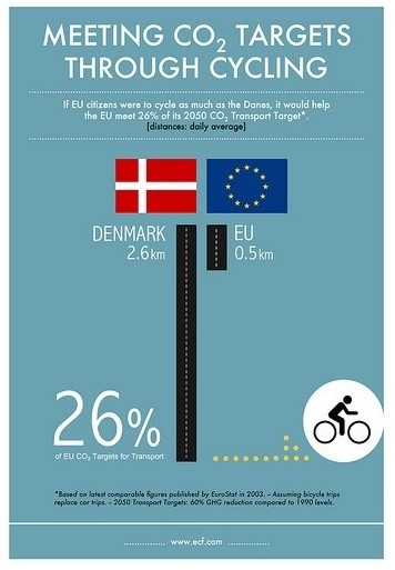 Selon son étude, si chaque Européen roulait autant qu’un citoyen du Danemark (c’est-à-dire, en moyenne, 2,6 km par jour) cela mettrait l’Europe au quart de la réduction attendue dans ses transports et déplacements.