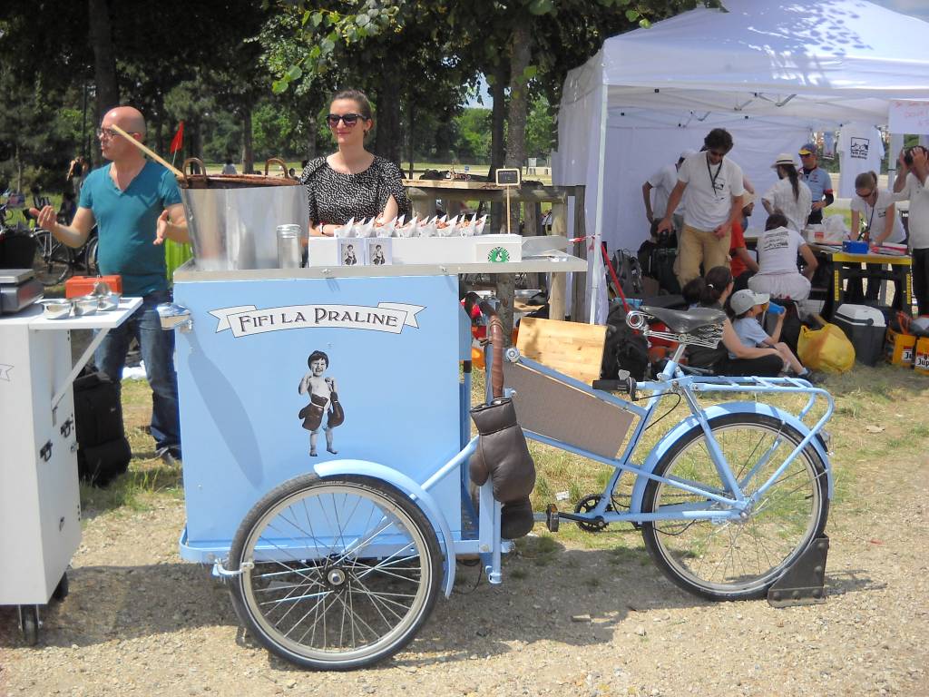 Fifi la praline. Créée en mars 2013, elle se pose dans les garden parties ou lors d'événements. Elle sera dans 15 jours au festival Peacock (parc floral de Paris), était à Anjou vélo vintage, se rencontre aussi à la cité de la mode à Paris. Jean-Philippe et Julia Casteuble fabriquent sur place leurs pralines et les distribuent illico !