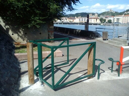 Parfois l'inutilité de l'équipement pourrait même faire sourire si tout cela n'était profondément gênant. Ainsi à Ste Colombe, la barrière que vous découvrez sur les deux photos du bas sépare la Via Rhôna et un quai réservé aux riverains et fermé par une borne électrique ...