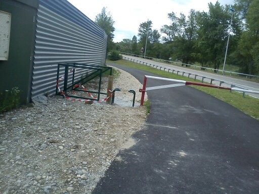 Ainsi sur la photo à droite, la barrière en bois a été installée plusieurs semaines après le reste de l'équipement alors que beaucoup de cyclistes contournaient doucement la barrière en passant dans les graviers...