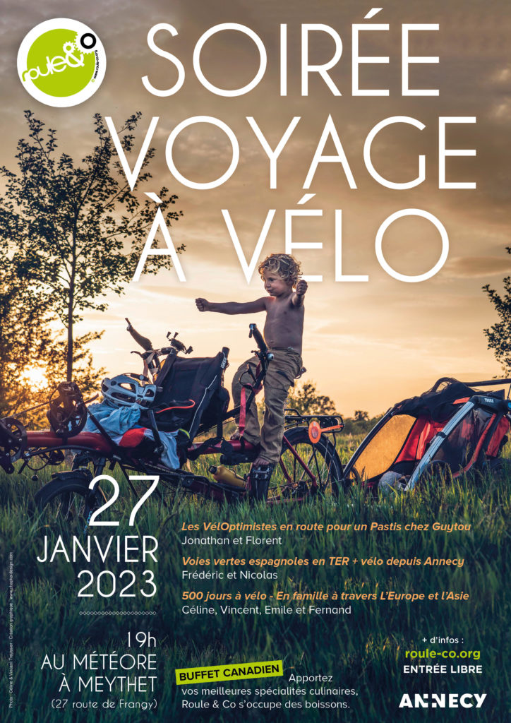 Roule et Co, association de promotion du vélo sur Annecy, organise sa soirée voyage à vélo le vendredi 27/01/23Salle le Météore, 27 route de Frangy à Meythet (74) à 19 h. Gratuit.